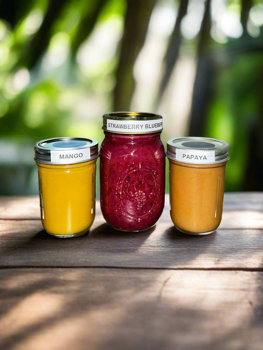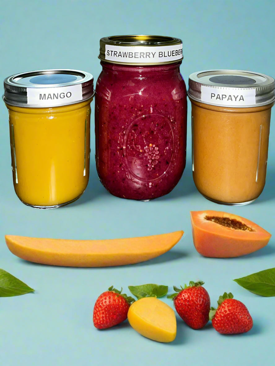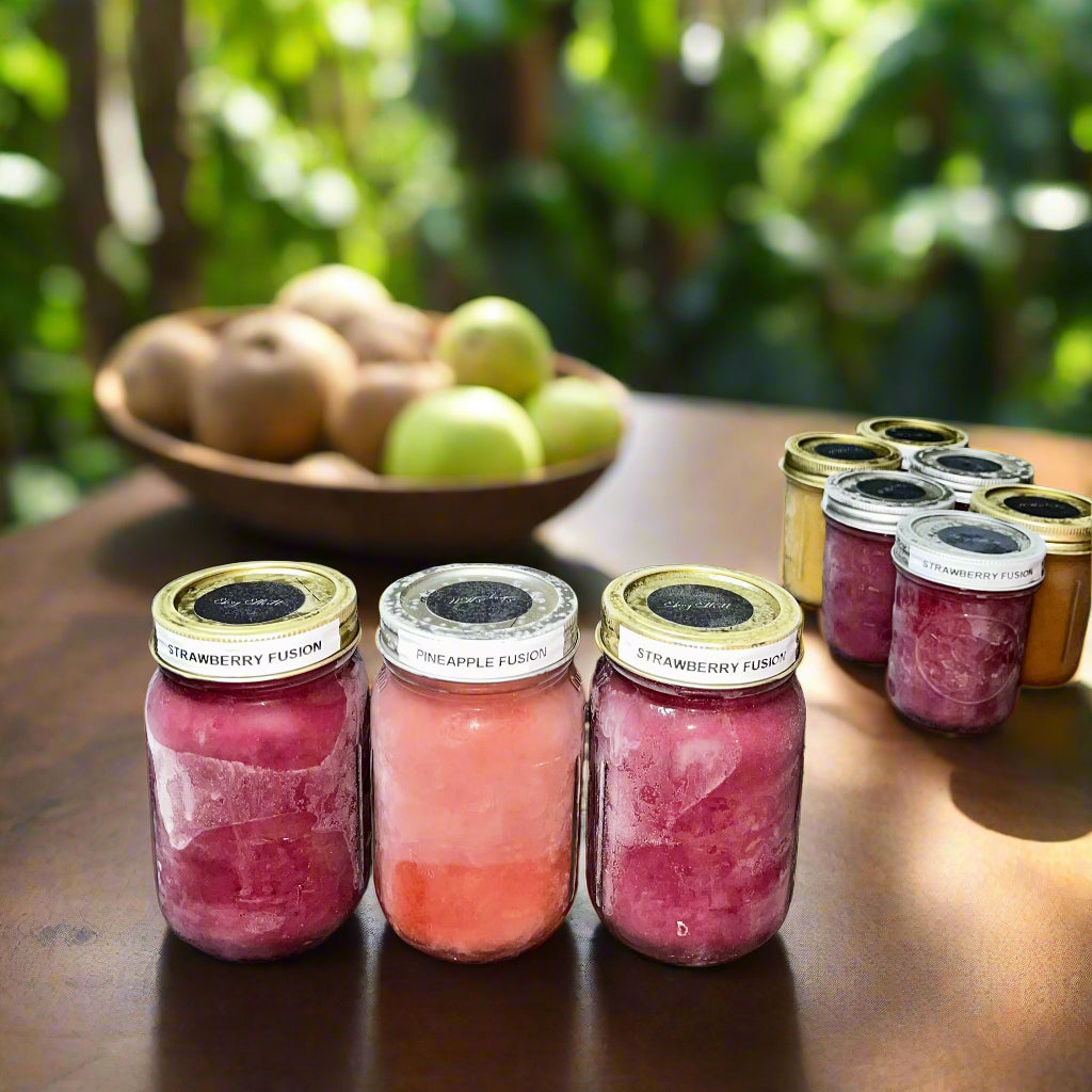 Seamoss gel infused with all natural, fresh fruits such as strawberries, blueberries, pineapple, mango, papaya, kiwi, etc. Our seamoss gel includes dates and spring alkaline water.